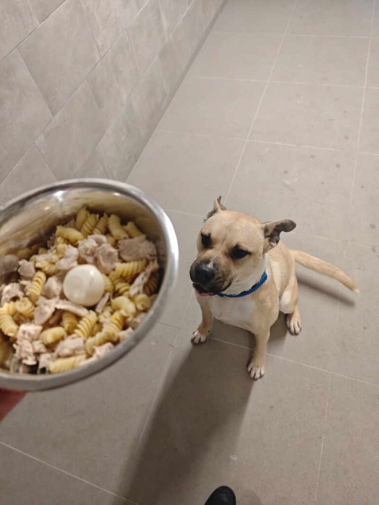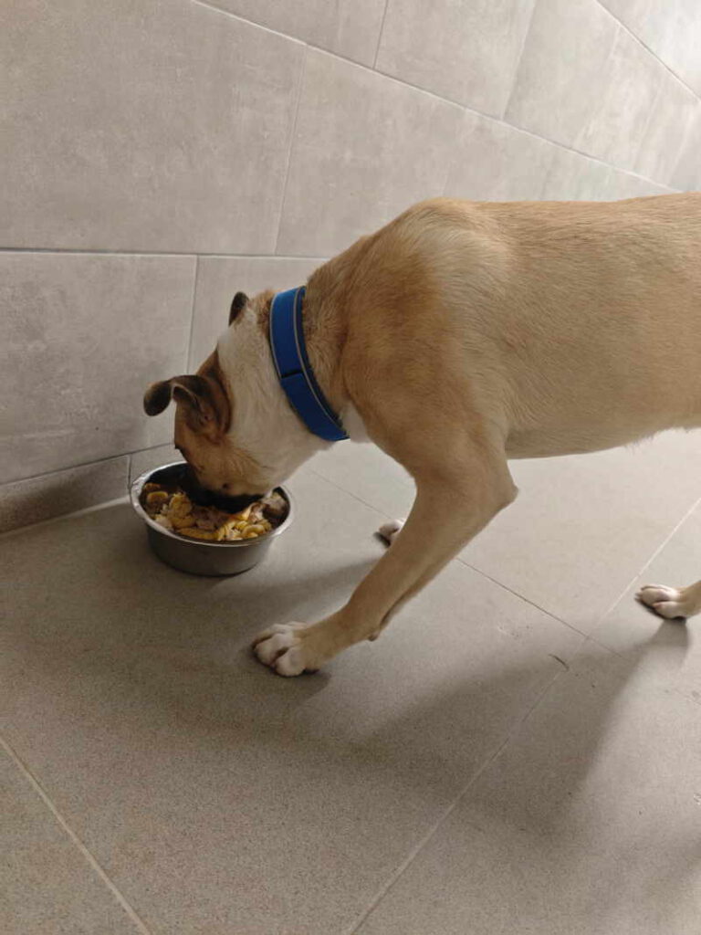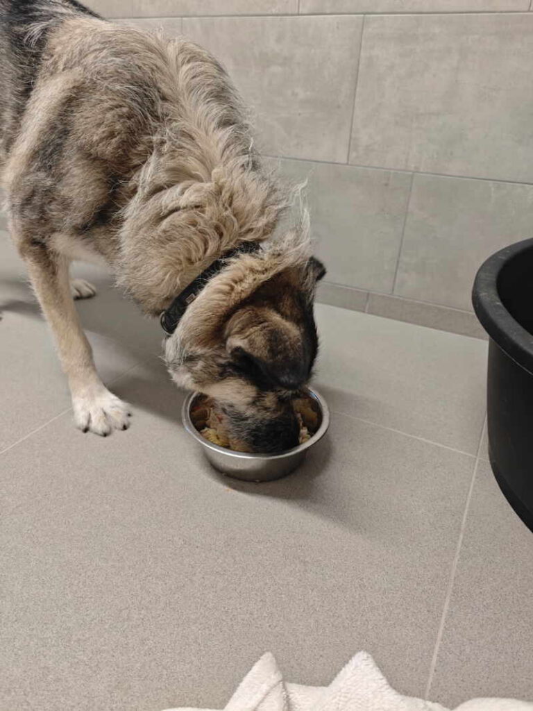Wir merkten Mariana an, dass sie Schmerzen beim Laufen hat, dann hat sie das Bein nicht mehr richtig belastet und schließlich gab es die Diagnose Patellaluxation. Da war ihr Kumpel schon ins neue Zuhause gezogen und Mariana stand alleine da. Seitdem darf sie ganz oft nachmittags mit ins Tierheim-Büro, und sie ist wirklich eine unglaublich gute Bürohündin. Das könnte auch für die Zukunft ein Wunschberuf sein. Sie ist ruhig, zurückhaltend, unaufdringlich – das erwartet sie aber auch von den Menschen. Komm also nicht direkt auf sie zu gestürmt, sondern lass ihr Zeit und Raum zu Dir zu kommen. Und Leute, wenn es Euch schlecht geht, ihr Schmerzen habt und aktuell ein nacktes Bein und eine Tröte um den Kopf, dann wäre die Zurückhaltung noch größer. Es gab halt schon bessere Tage. Wir haben aber noch nie erlebt, dass sie sich wehrt. Sie friert nur ein oder rollte mit den Augen. Außerdem hab ich gehört, dass die hübsche Mariana auch ein kleiner Glourme ist (woher sie das hat, weiß ich zwar nicht..) daher: Bestechungsversuche bitte nur mit Leberwurst, am besten aus der Tube.